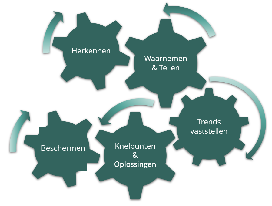 Soortenorganisaties hebben de bedoeling de kennis over de verspreiding en de trends van een specifieke wildesoortengroep in Nederland in kaart te brengen, om wetenschappelijke redenen maar vooral ook uit het oogpunt van natuurbescherming. Dat gaat in vijf stappen die in de bijgaande figuur als raderen zijn weergegeven.
