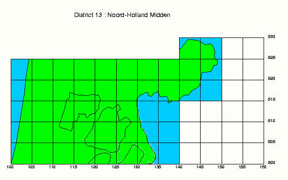 District 13 is het middendeel van Noord Holland dat aan de zuidzijde ruwweg wordt begrensd door de lijn Wijk aan Zee-Purmerend (Amersfoort-coördinaat 500) en aan de noordzijde door de lijn Schagen-Enkhuizen (Amersfoort-coördinaat 525). West-Oost loopt het district van de Noordzee tot het Marker- en IJsselmeer: van Zee tot Meer. Zie het kaartje hieronder.