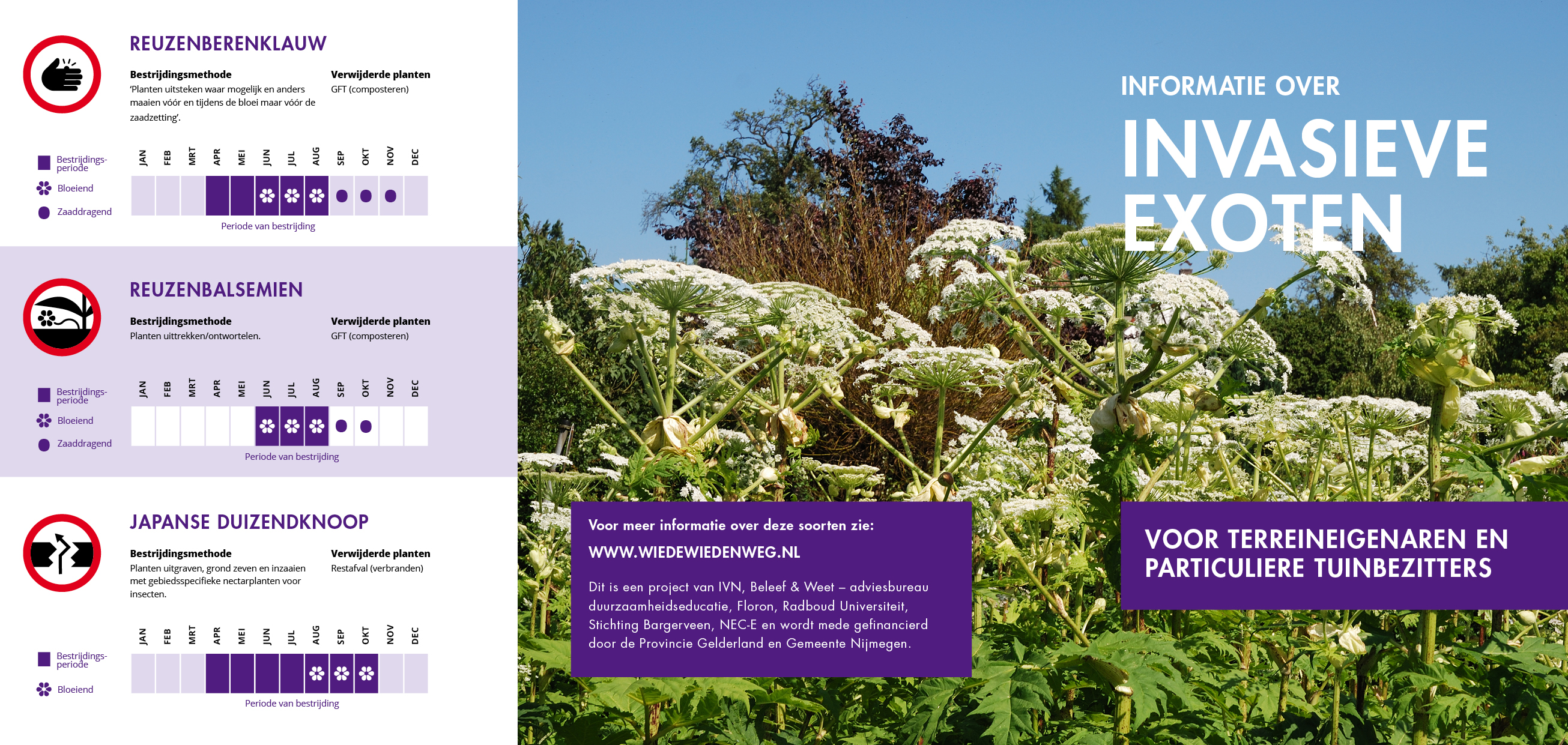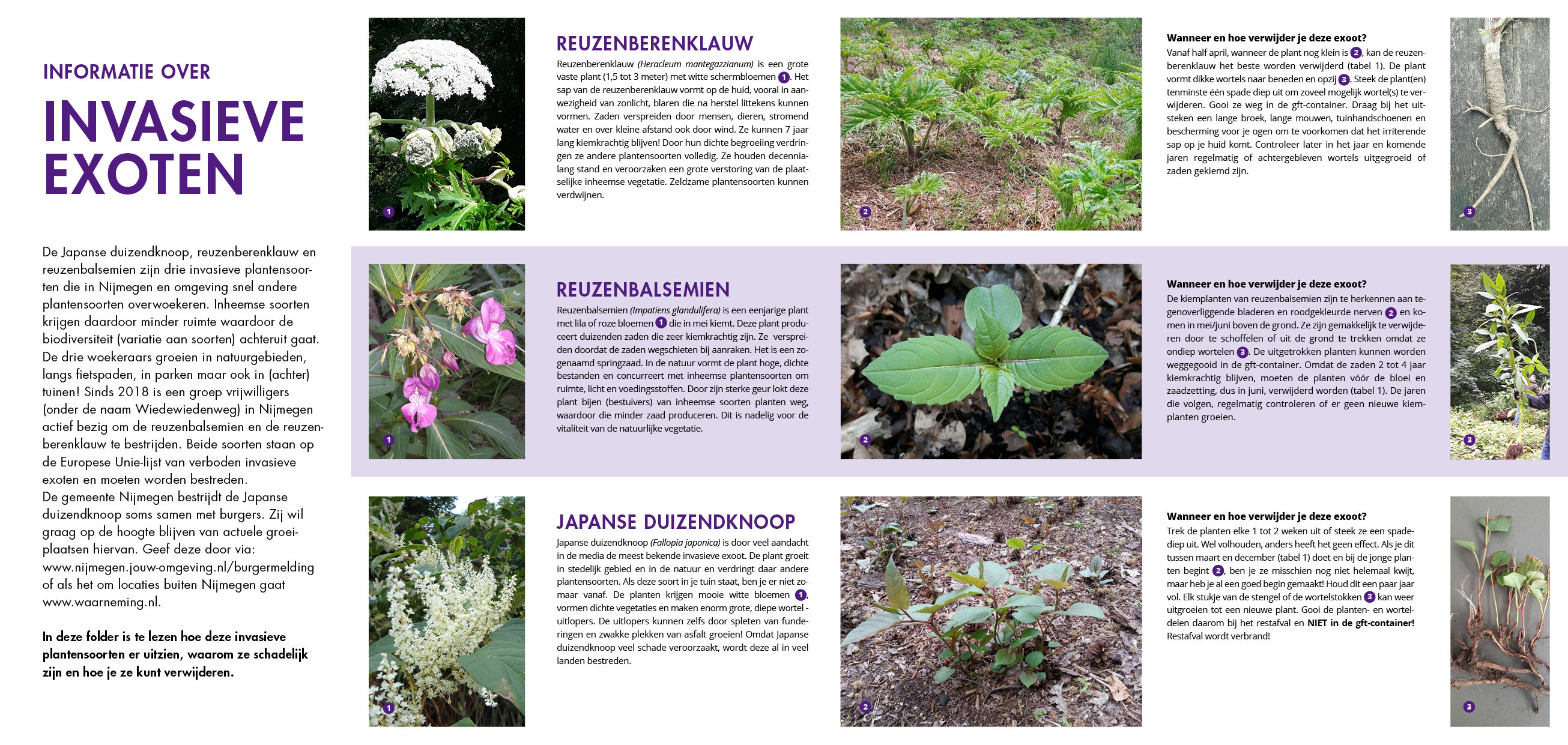 Er zijn drie plantensoorten in Nijmegen en omgeving die snel andere soorten overwoekeren: Japanse duizendknoop, reuzenberenklauw en reuzenbalsemien. Ze groeien in natuurgebieden, langs fietspaden, in parken maar ook gewoon in achtertuinen! De laatste twee soorten staan op de zogenaamde Unielijst: verboden invasieve exoten die bestreden moeten worden.